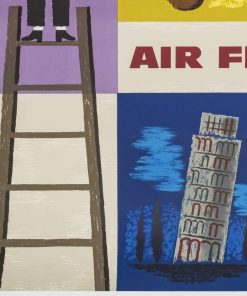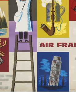 Affiche réalisée par Jean Carlu en 1957 pour promouvoir le tourisme en Europe via la compagnie aérienne française Air France, on distingue que différents pays européens sont représentés sur l’affiche.