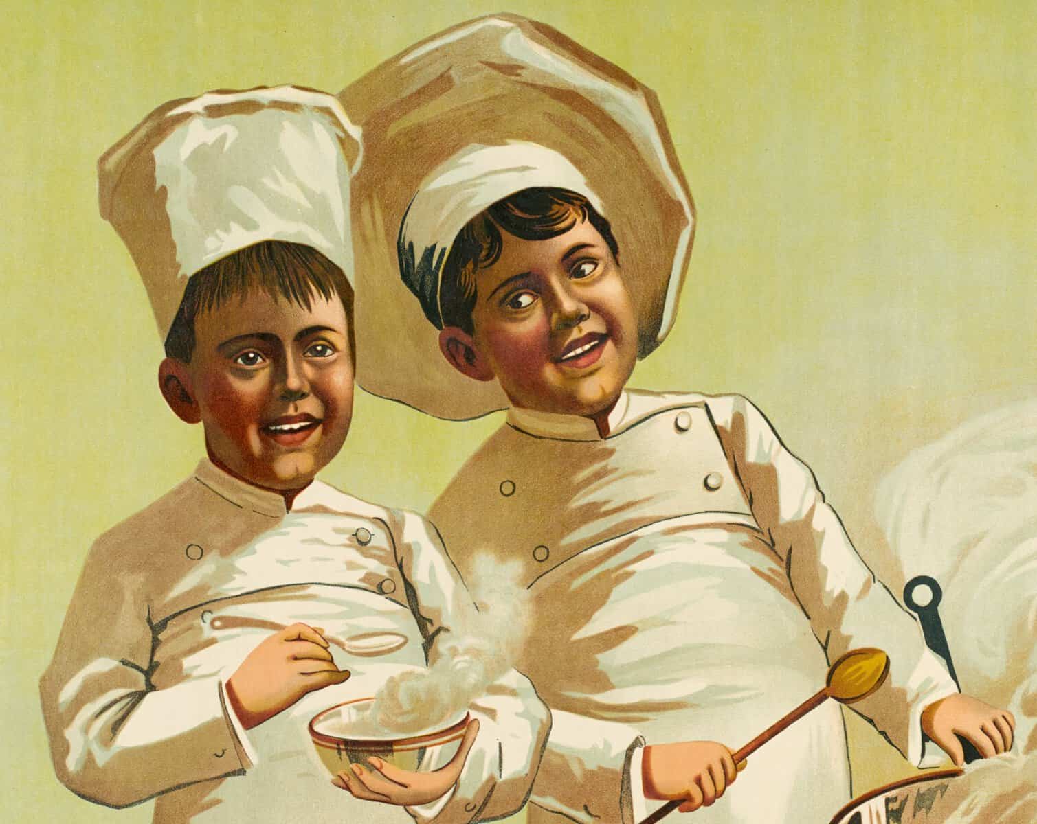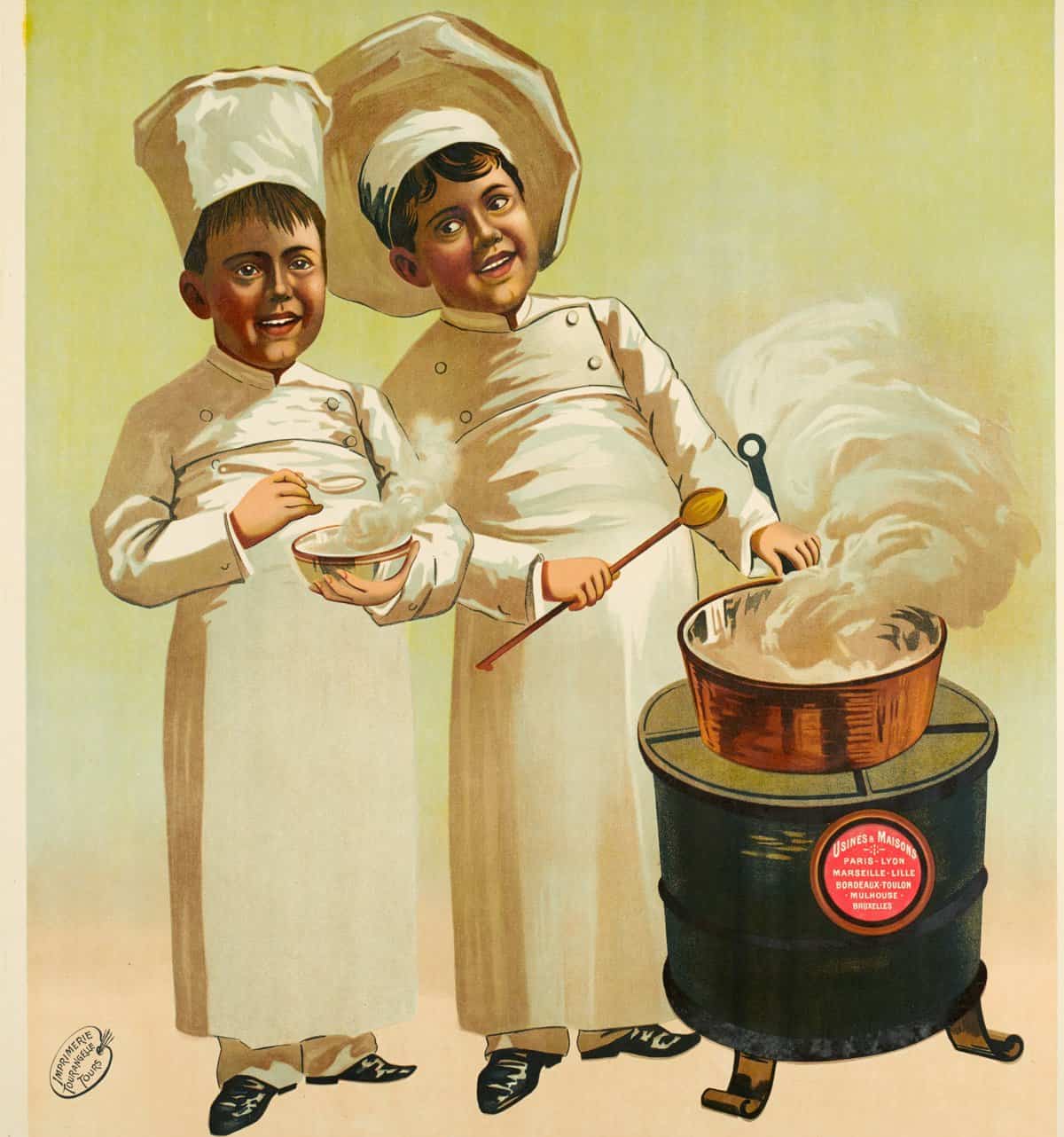 Sur l’affiche, deux jeunes marmitons portent la veste à double boutonnage, le pantalon et la toque, vêtements typiques de l’apprenti cuisinier. Ils font cuire des pâtes dans une casserole en cuivre sur un poêle.