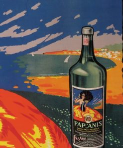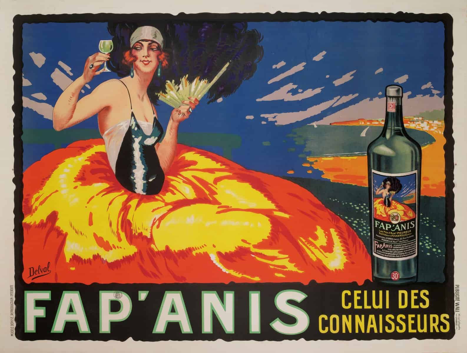 Le personnage féminin sur l’affiche est une fameuse danseuse et chanteuse Marseillaise, Gaby Deslys (1881-1920). Elle fait ici la promotion de l’apéritif dans une robe typique des Années folles avec à l’arrière-plan un paysage de la Côte d’Azur (Méditerranée).