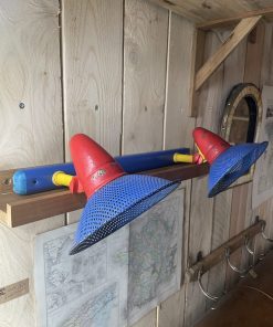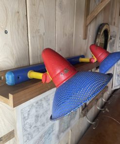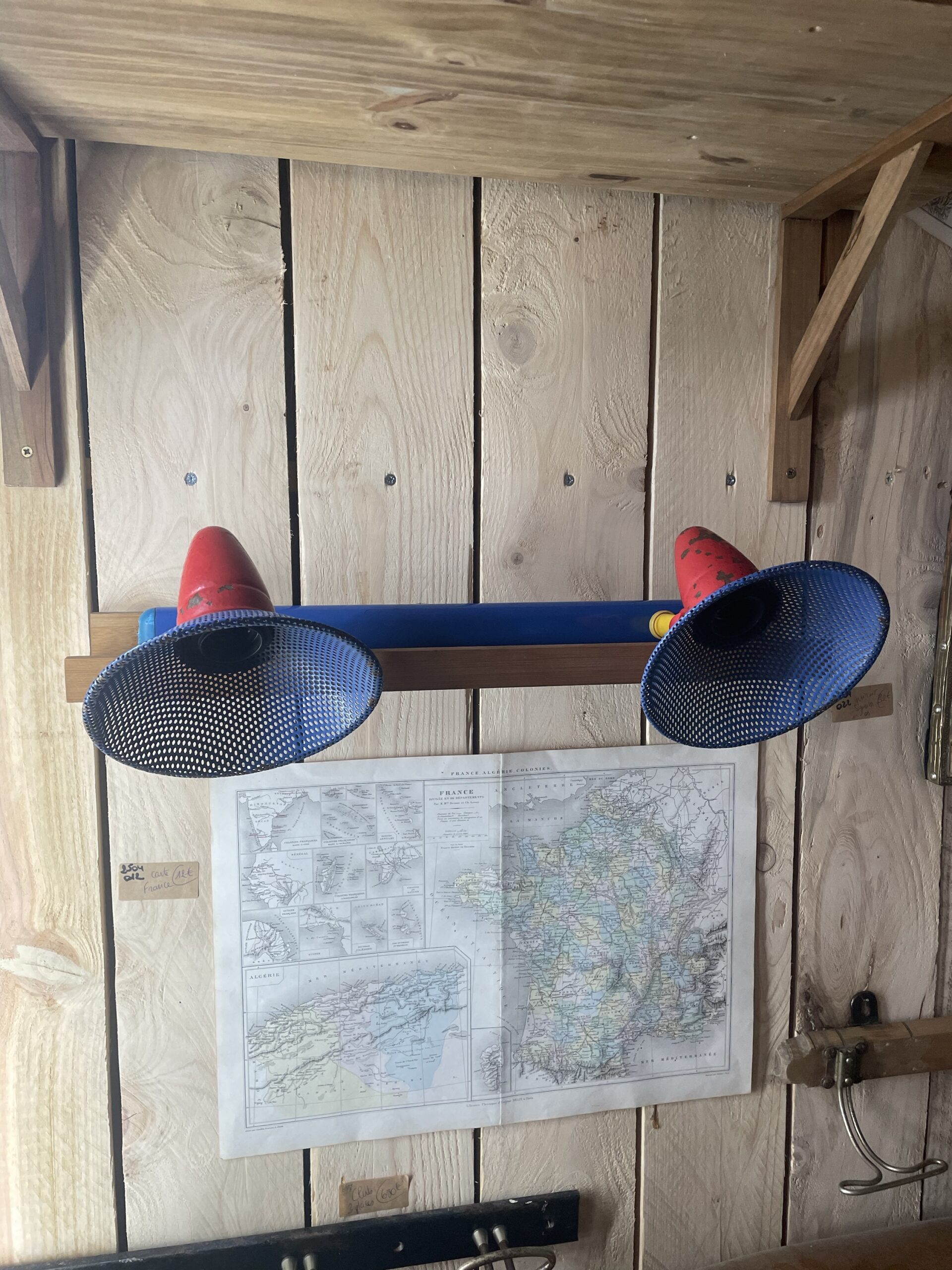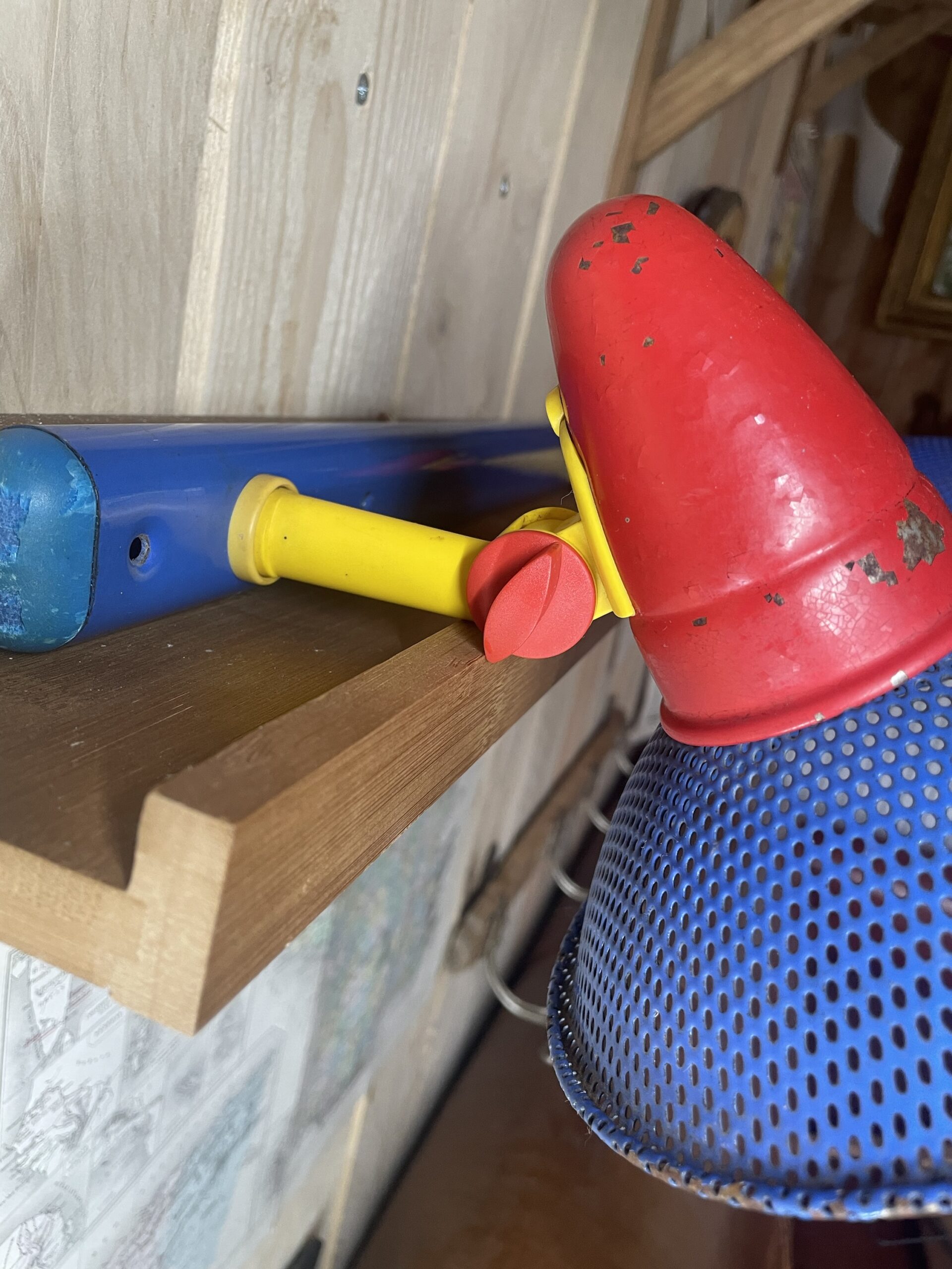 Traces de rouille sur le métal, peinture rouge écaillée, plastique bleu abîmé sur les extrémités