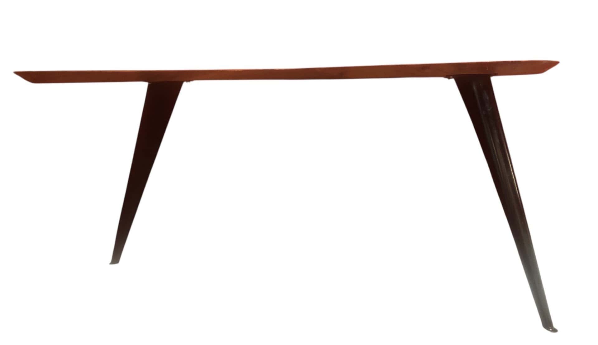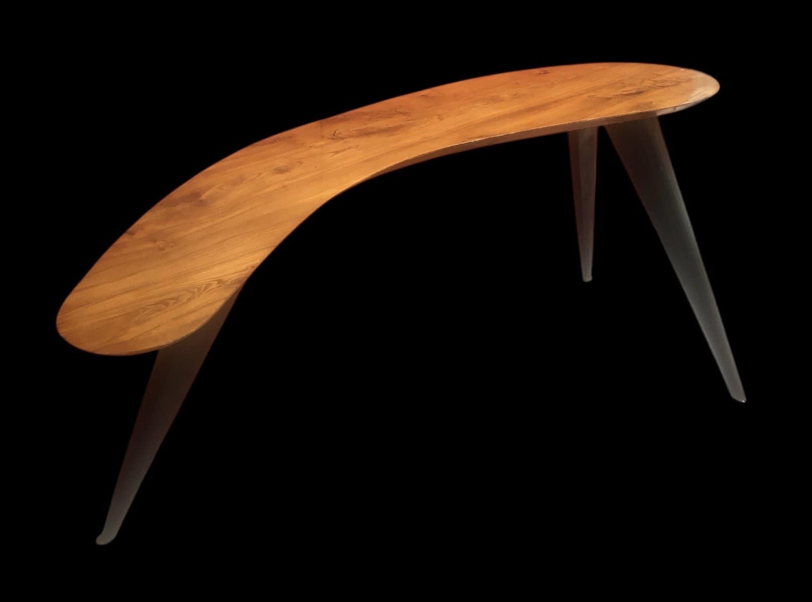 Bureau Boomerang de style design en bois fruitier reposant sur trois pieds en métal.