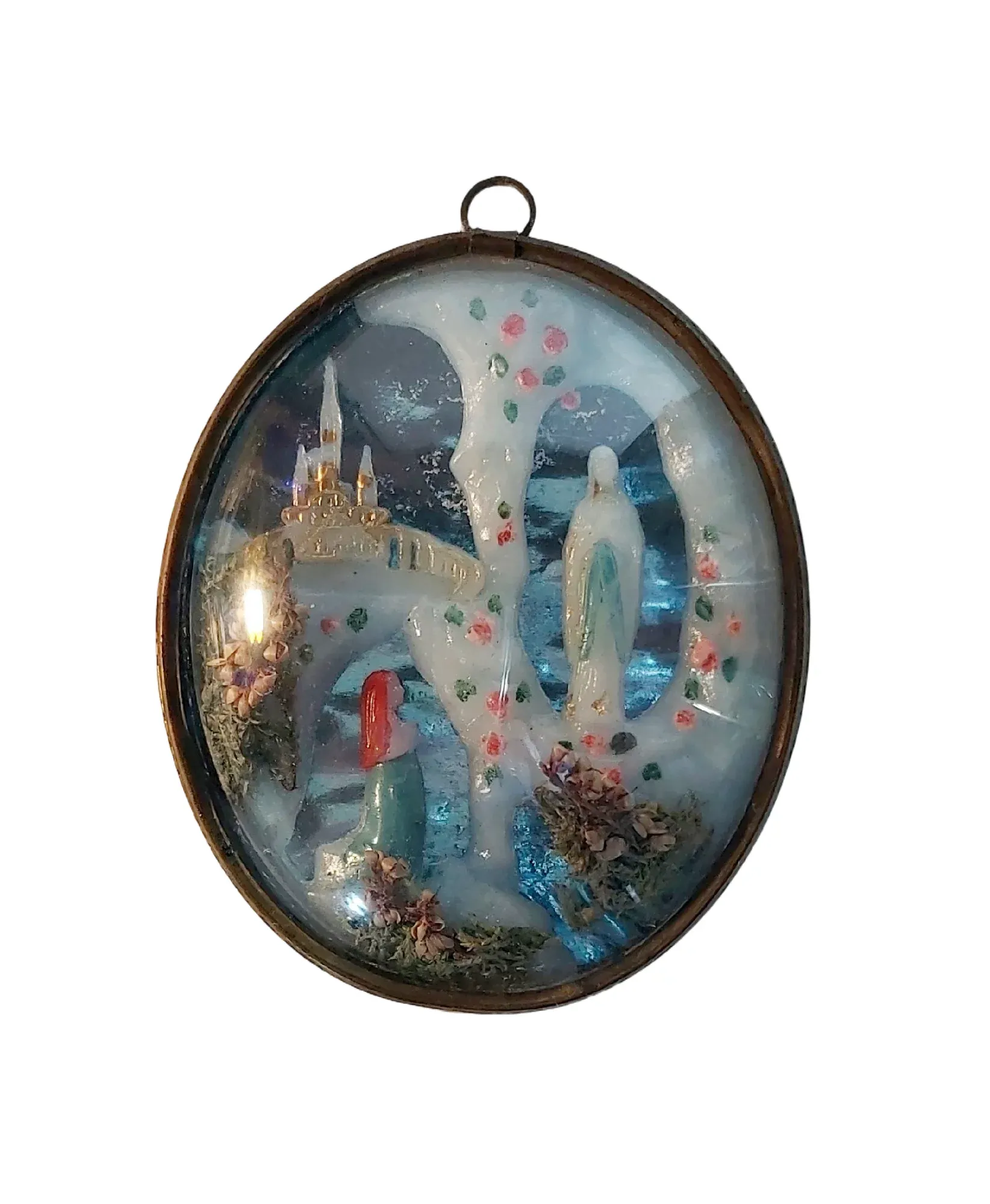 Petit Cadre en Verre Bombé Souvenir de Lourdes.