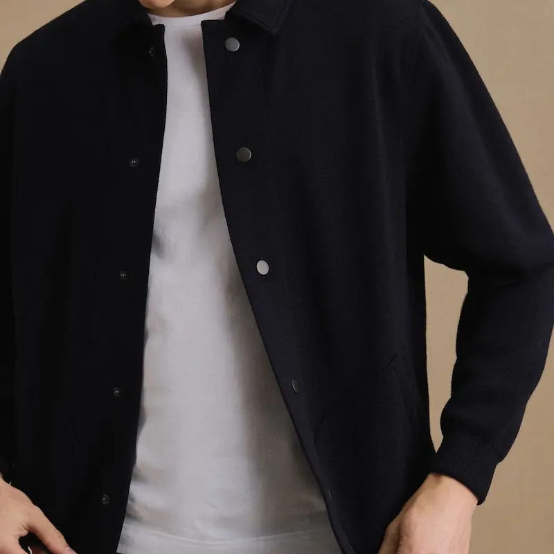 Découvrez la Coach jacket Le Minor bleu marine en maille Milano. Cette pièce forte d’exception, fabriquée en 100% laine vierge, incarne la réinterprétation contemporaine par Le Minor d’un classique du vestiaire masculin. En effet, ce blouson s’inspire de la veste Coach Jacket des années 90. Cette pièce associe le col chemise, les boutons pression et les poches plaquées arrondies pour un look authentique. Fabriquée en maille Milano réputée pour sa robustesse et son tomber parfait, cette veste allie style et fonctionnalité. Idéale pour un style casual-chic, sa couleur bleu marine est un basique intemporel et indémodable. Conçue avec des coupes amples et soignées, elle offre une liberté de mouvement totale, parfaitement adaptée à un mode de vie actif et urbain.