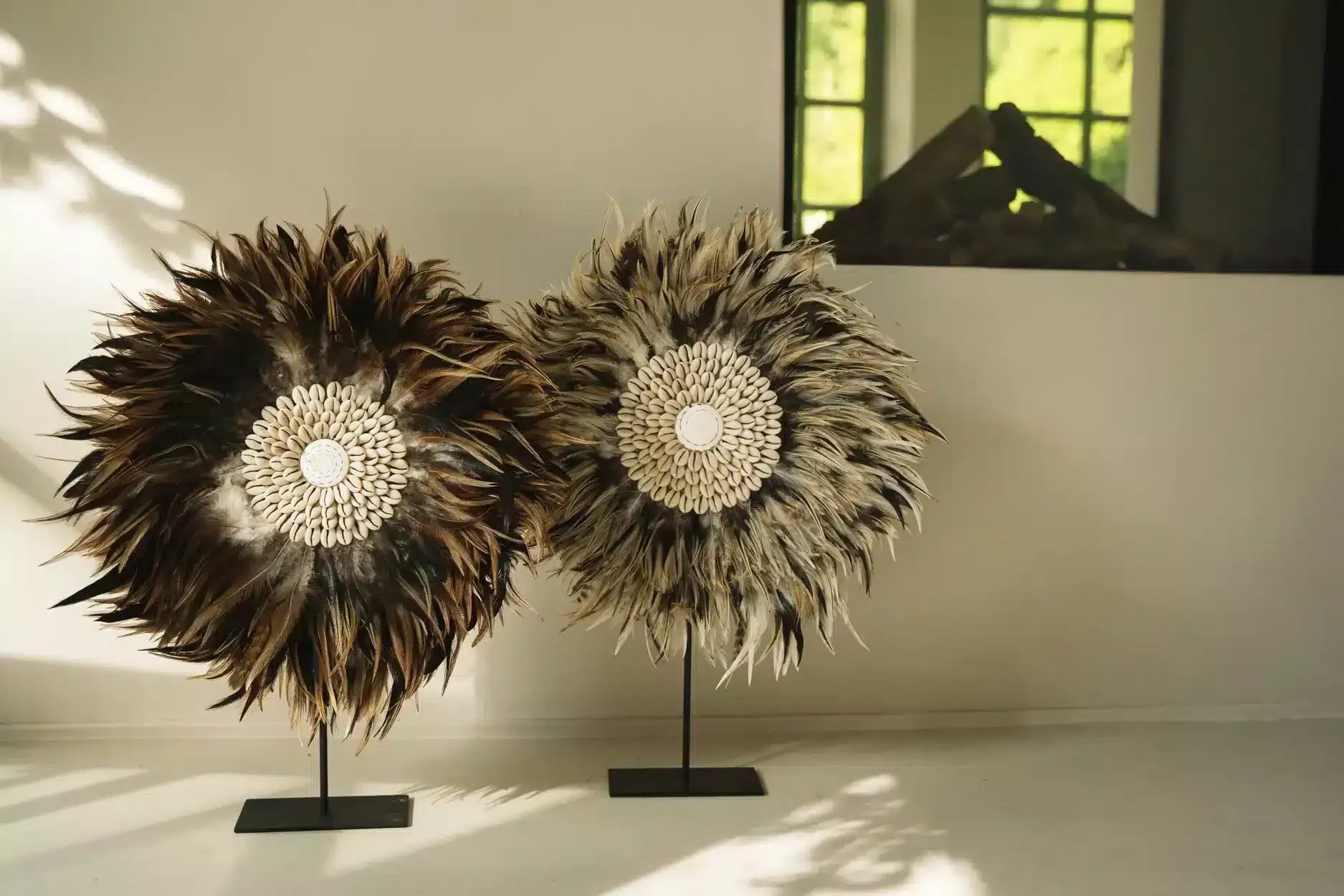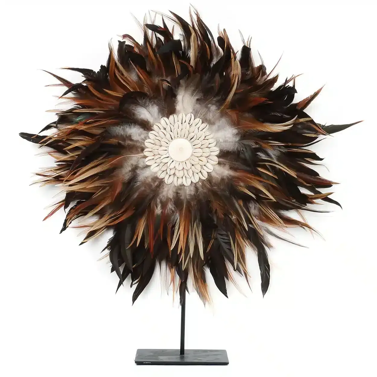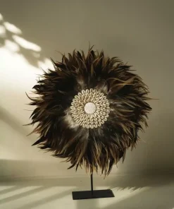 magnifique présentoir à plumes sur pied est une véritable beauté bohème pour décorer n’importe quel endroit de votre intérieur, terrasse couverte ou jardin. Le cercle central est entouré de coquilles placées à la main.