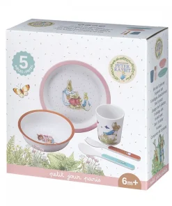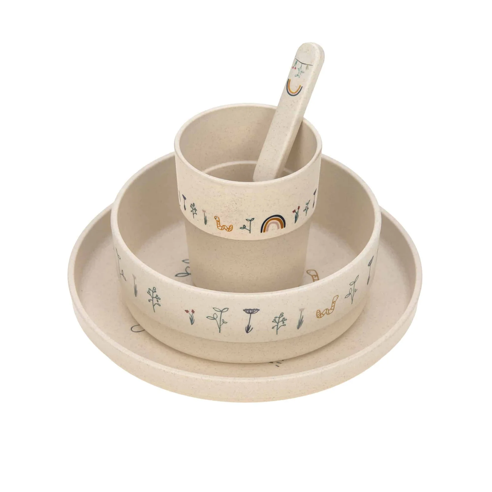 Ce joli coffret repas avec son arc-en-ciel et ses motifs de jardin invite les petits gourmands à se familiariser avec la nature à table. L’ensemble est composé d’une assiette, d’un bol, d’une tasse et d’une cuillère.