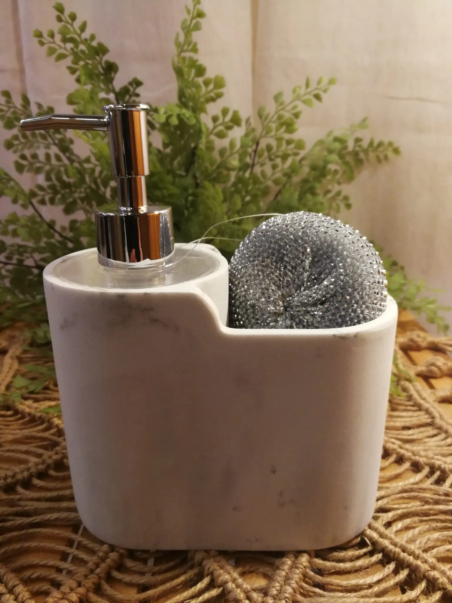 Doseur résine cuisine imitation marbre blanc avec éponge dimensions 15.5 x 8 x 18.2 cm