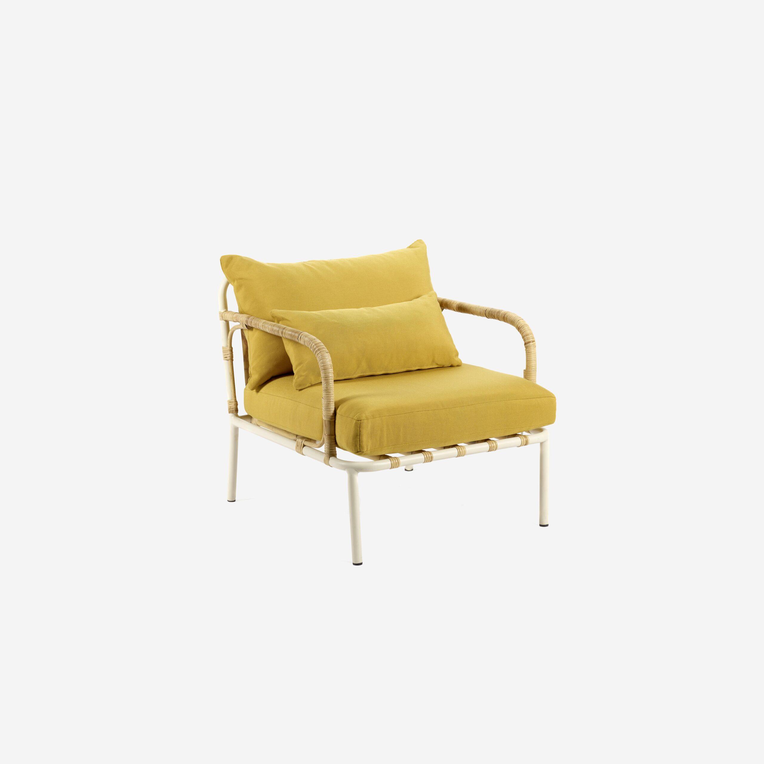 René Barba travaille avec différents matériaux et dessine le fauteuil lounge Capizzi avec une structure mixant aluminium et rotin. Au look retro, il offre un confort moderne et optimal grâce à ses coussins moelleux et réconfortant.