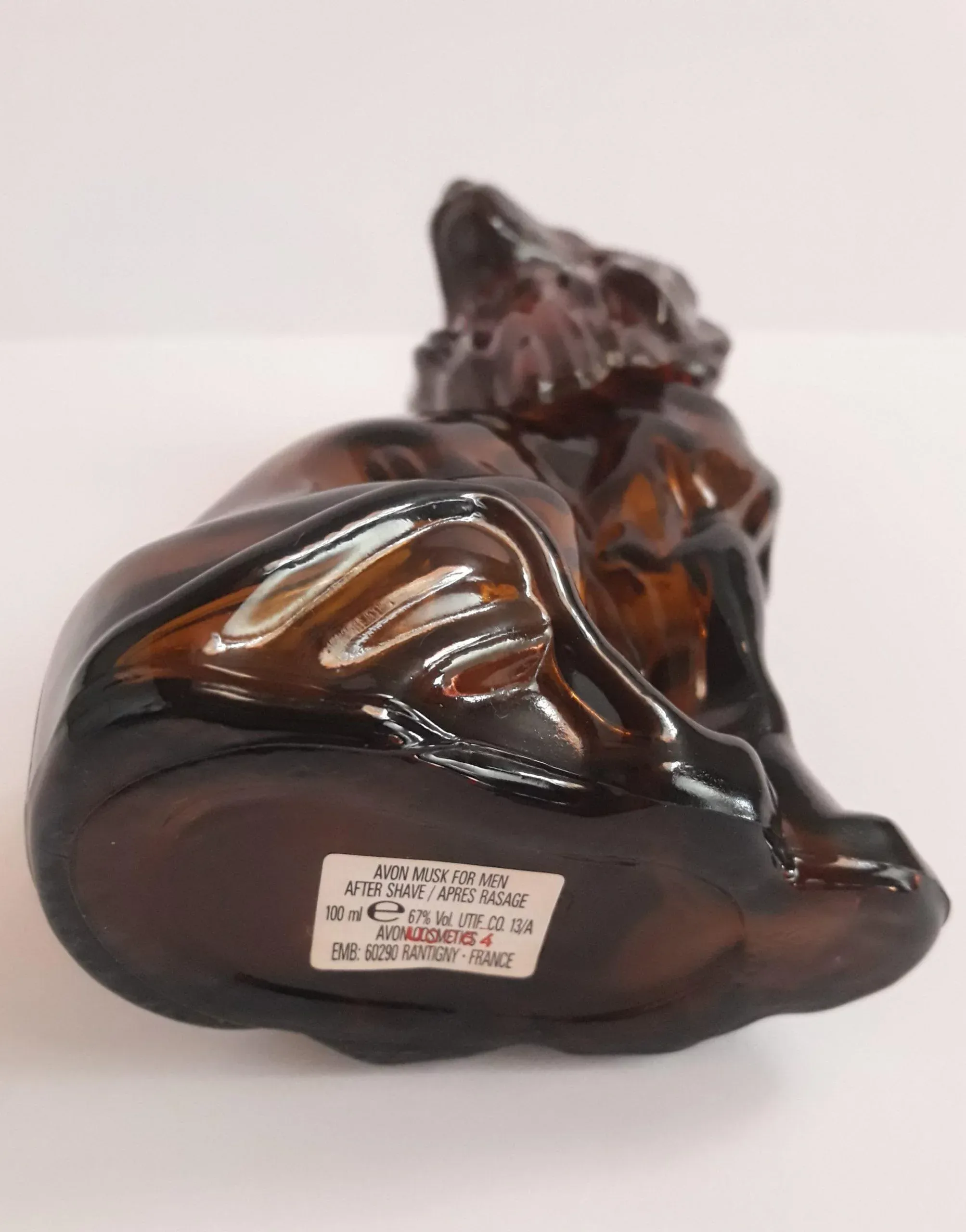 Flacon de parfum Avon en forme de lion. Le flacon est vide mais l’odeur du parfum est toujours là.