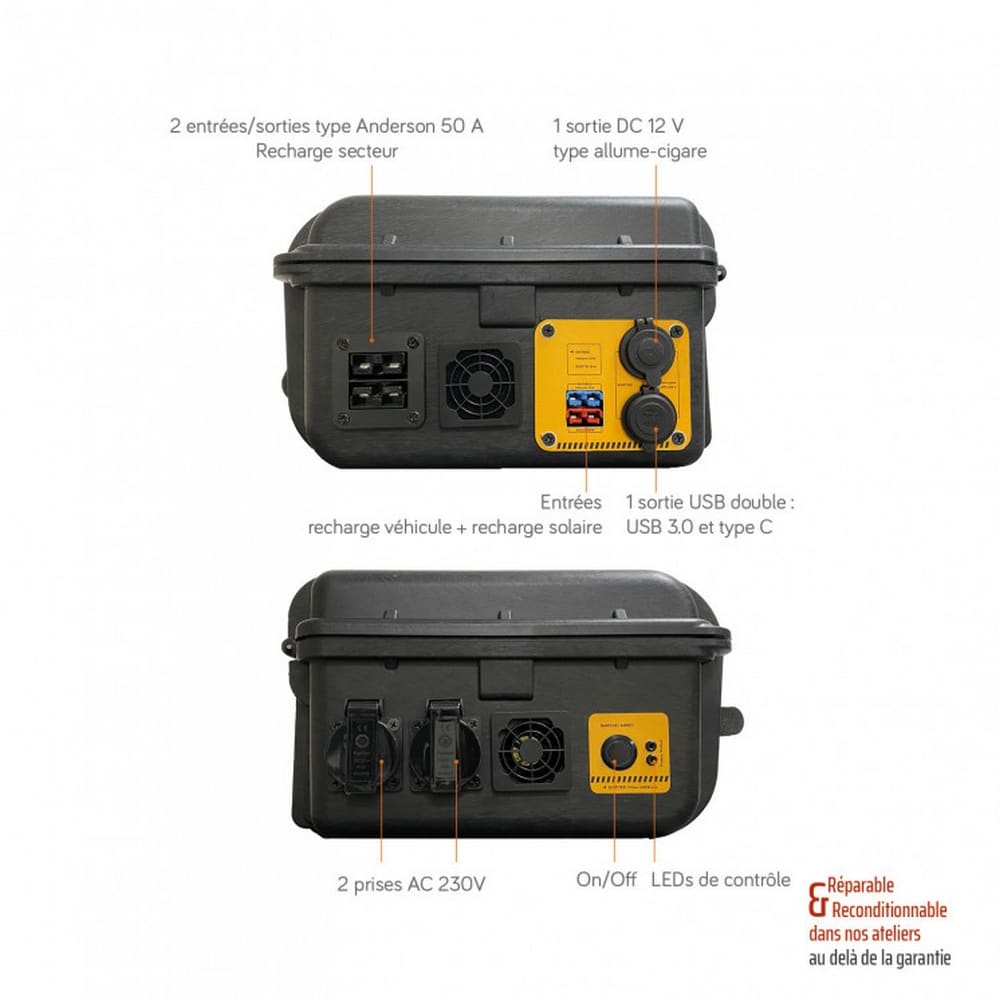 Rechargez votre valise par votre panneau solaire (régulateur solaire MPPT), par l’alternateur de votre véhicule (Booster DC/DC Euro6) ou par le secteur (chargeur AC/DC).