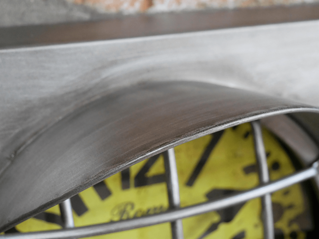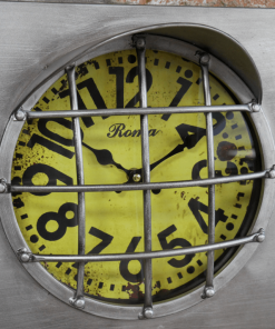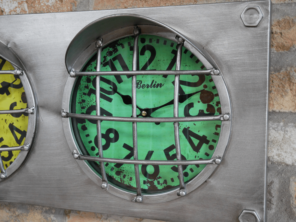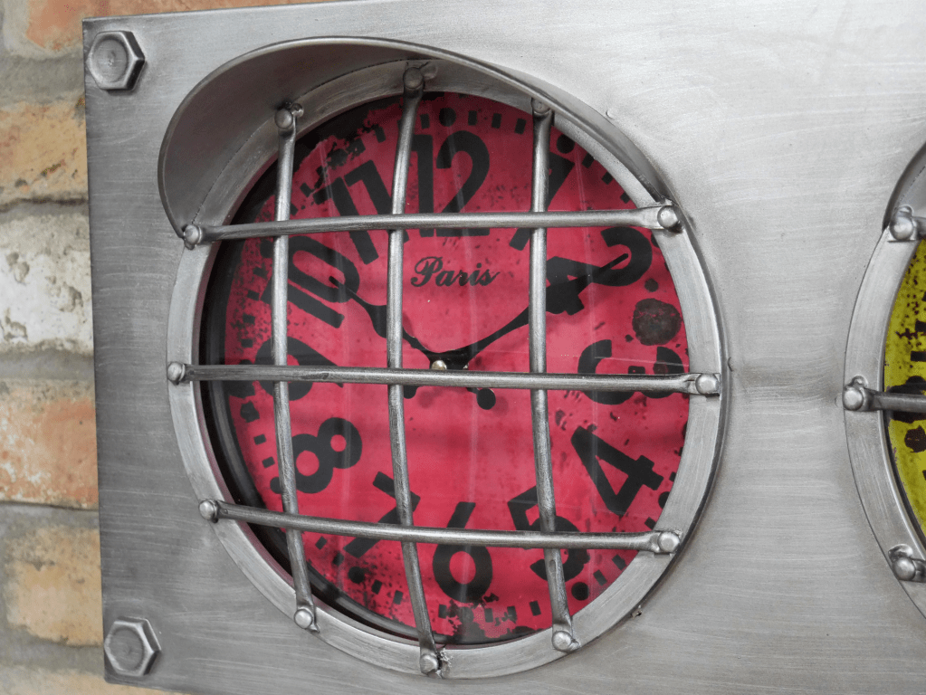 Horloge murale en métal avec trois cadrans de différentes couleurs, à la façon de phares avec grilles et décor d’écrous qui donnent un style industriel, atelier.
