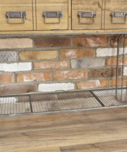 Meuble de rangement style industriel avec une porte et quatre tiroirs. Coté gauche se trouve six faut tiroirs sur l’abattant, à droite trois tiroirs en haut et un en dessous. Les portes étiquettes, le bois brut, le choix des poignées et le métal du support donnent un aspect industriel, atelier très réussi.