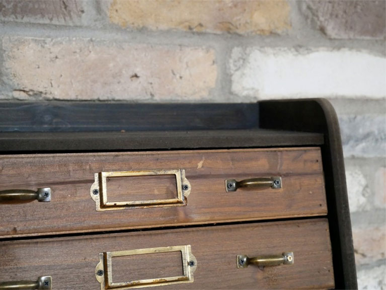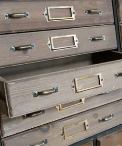 Meuble mural de métier avec 18 tiroirs de différentes tailles et formes. Avec les lettres en émail, des porte-étiquettes et poignées en laiton, le bois finition vieillie et le design, le meuble semble d’une autre époque, style atelier, vintage.