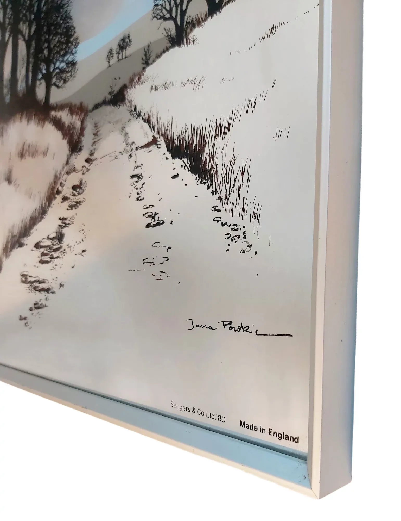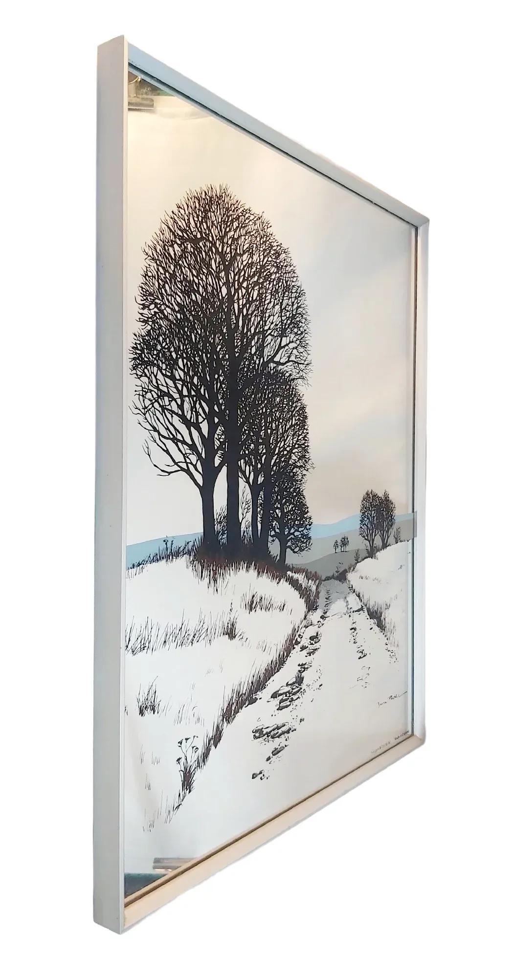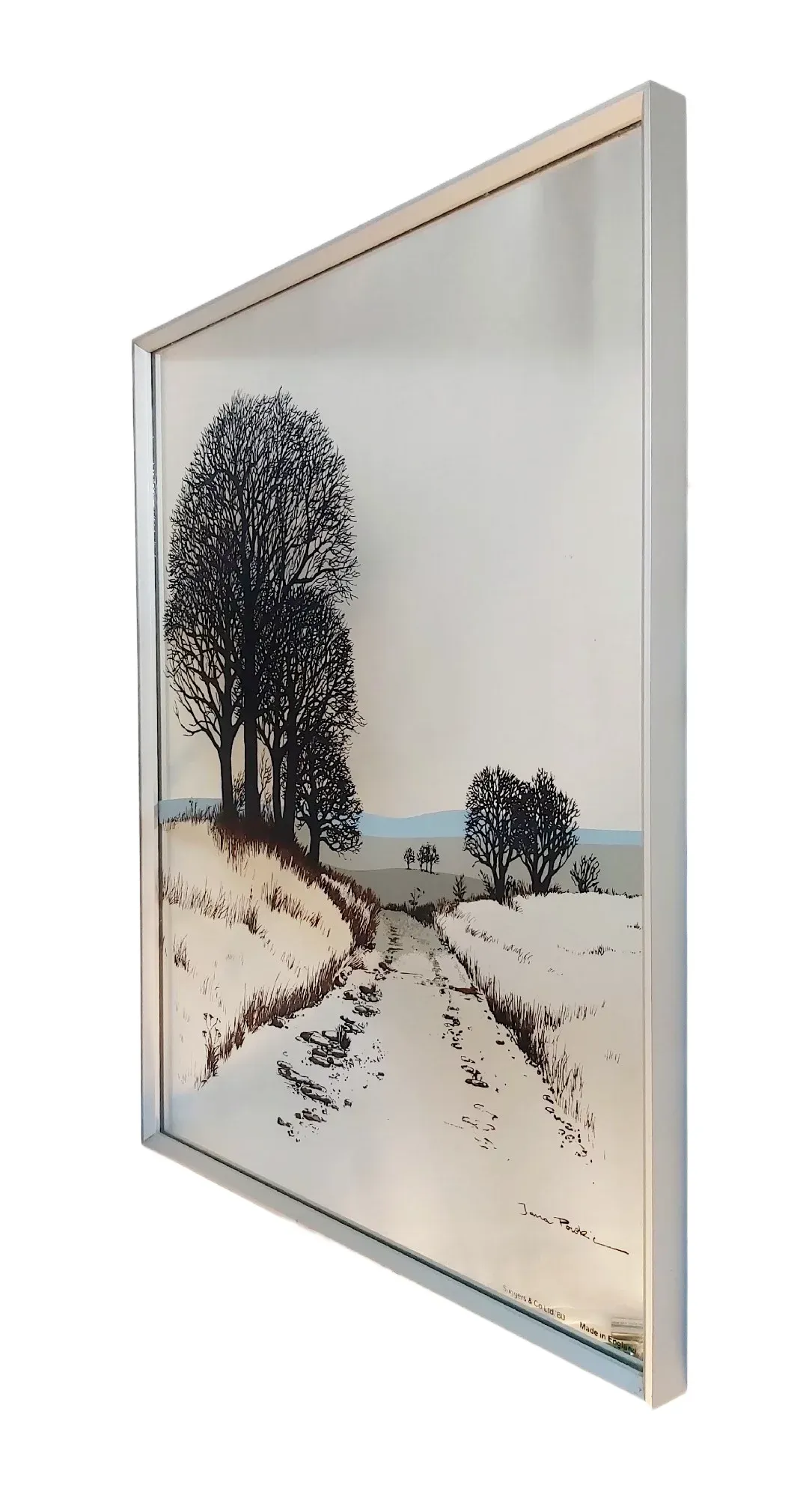 Miroir sérigraphié de 1980 signé par l’artiste Jana Powki – Décor rivière romantique.