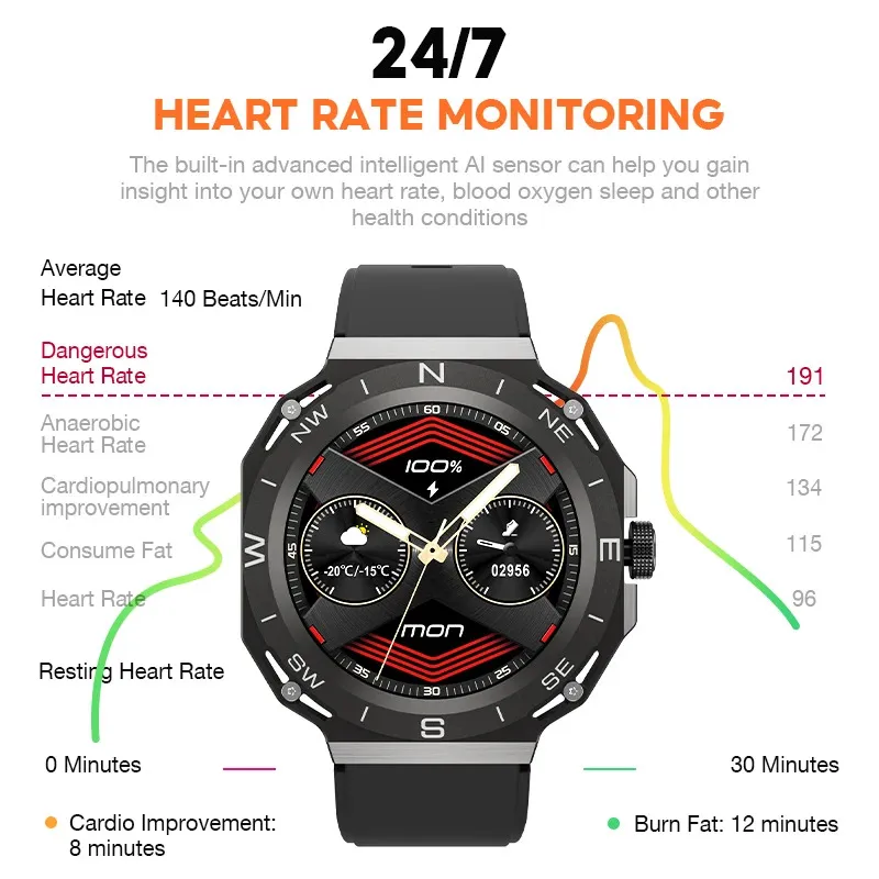 Notre montre connectée est équipée de capteurs avancés pour un suivi précis de votre fréquence cardiaque, de votre pression artérielle, et de votre niveau d’oxygène dans le sang. Elle surveille également votre sommeil, vous aide à maintenir une routine saine avec des rappels sédentaires et de boire de l’eau, et suit vos activités sportives grâce à son tracker de pas, calcul des calories brûlées, et enregistrement du kilométrage.