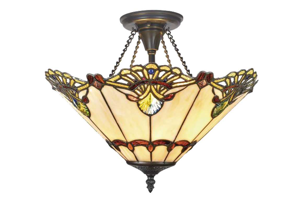 Plafonnier Tiffany esprit Art Nouveau. Le bord de chaque morceaux de verre est entouré d’une fine feuille de cuivre et soudé à l’étain pour l’assemblage de l’abat-jour.