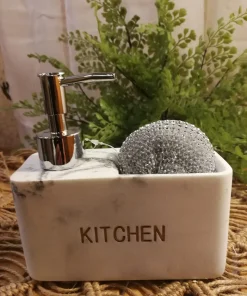 Doseur résine cuisine imitation marbre gris fonçé avec brosse et éponge dimensions 21 x 6.1 x 19 cm
