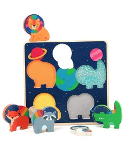 Chaque pièce du puzzle possède une texture unique. Certaines sont lisses comme les planètes, d’autres plus rugueuses comme les étoiles. Ce jeu permet aux enfants de développer leur coordination motrice et leur concentration tout en explorant l’univers.