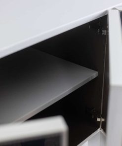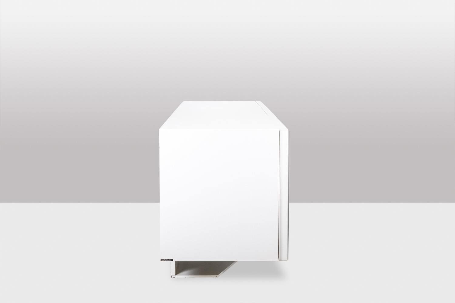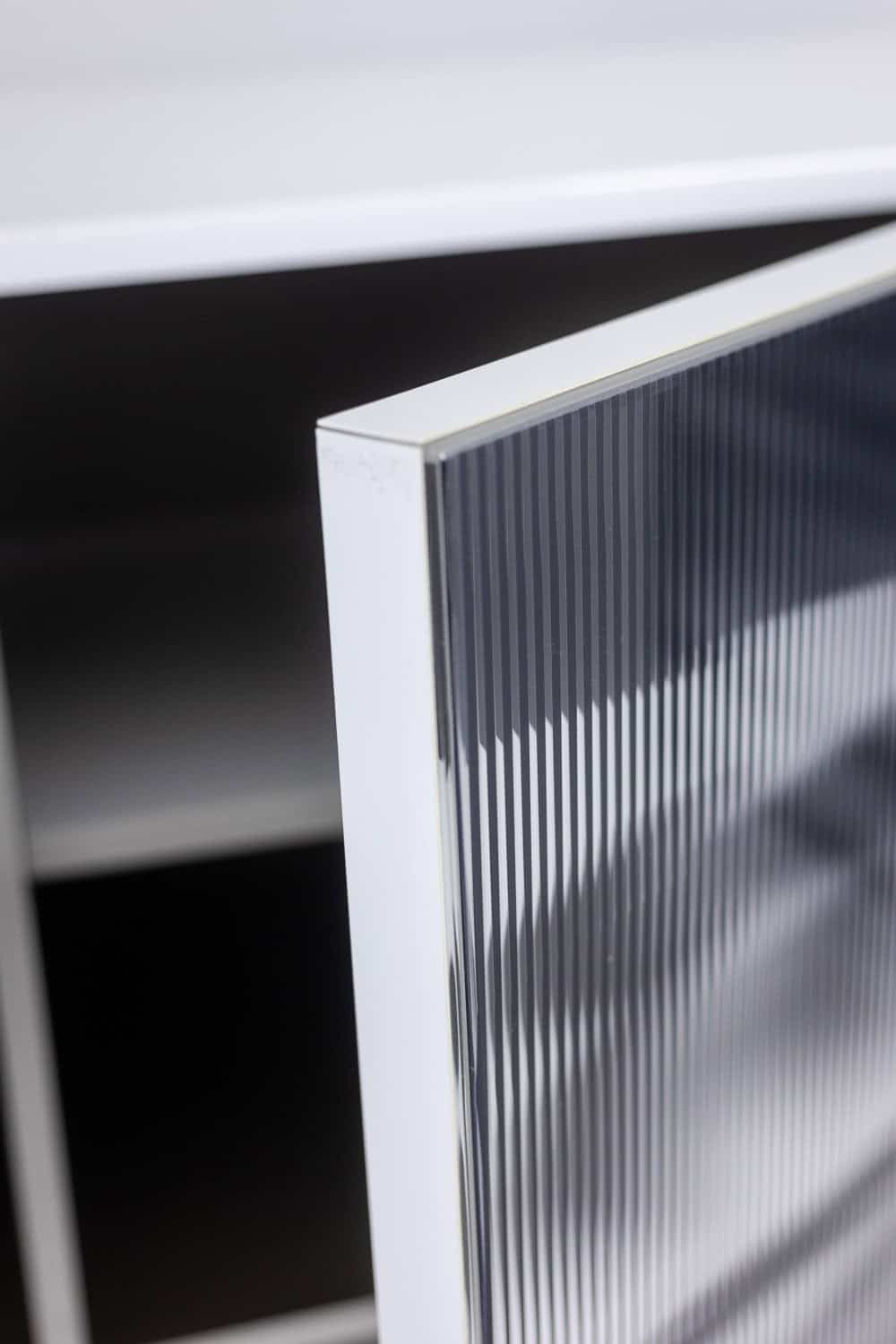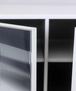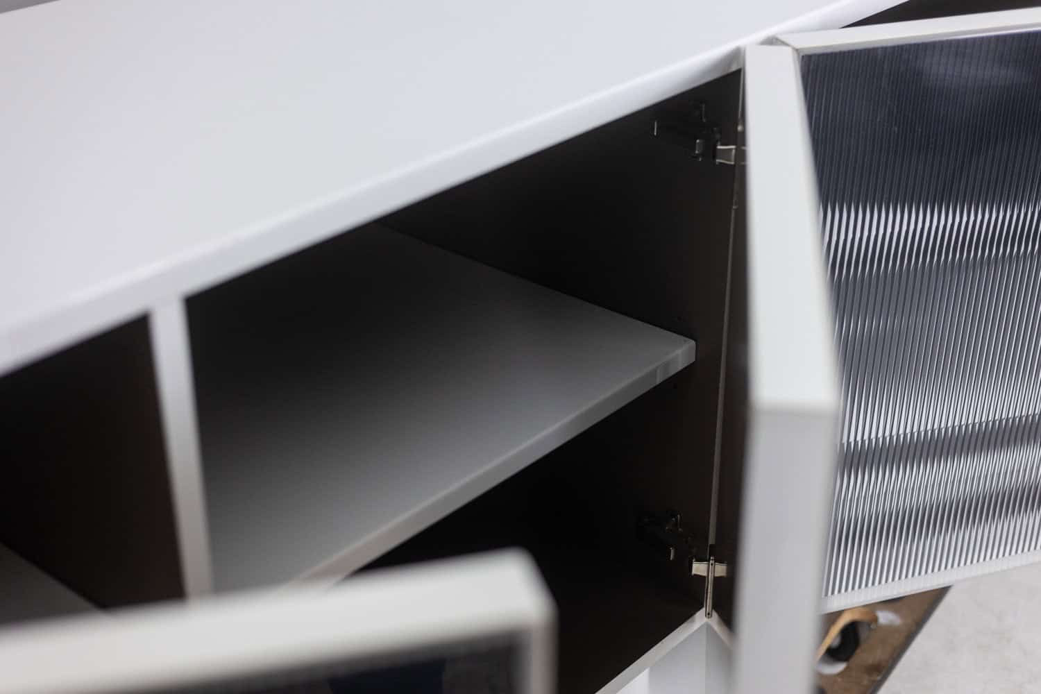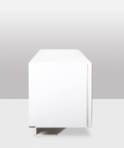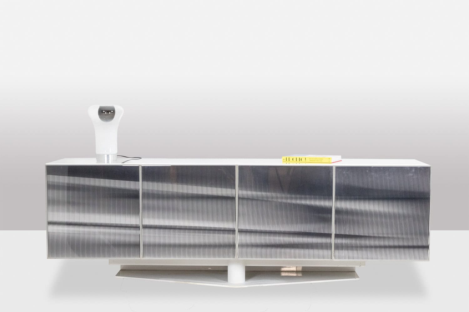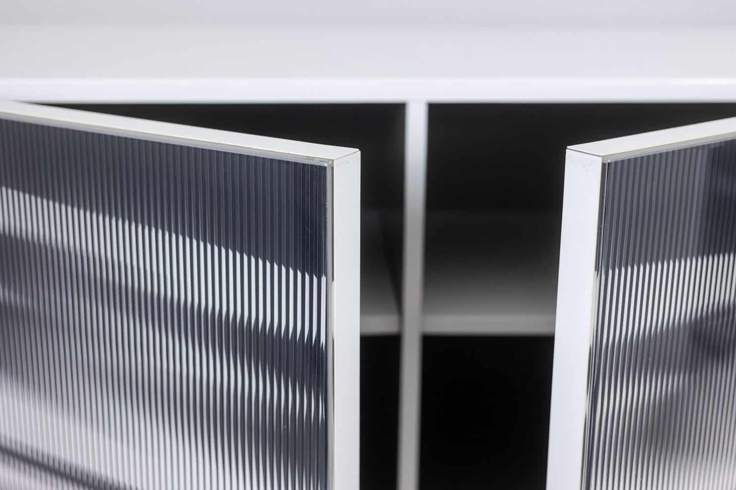 Enfilade ouvrant en façade par quatre portes à motifs « cinétique », de couleur noire et blanche, produisant un effet visuel. Piètement en métal laqué blanc de forme triangulaire et géométrique. Étagères à l’intérieur. Signé en bas de l’une des deux façades latérales.