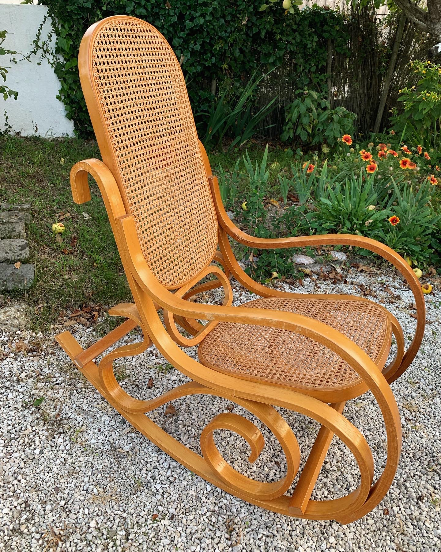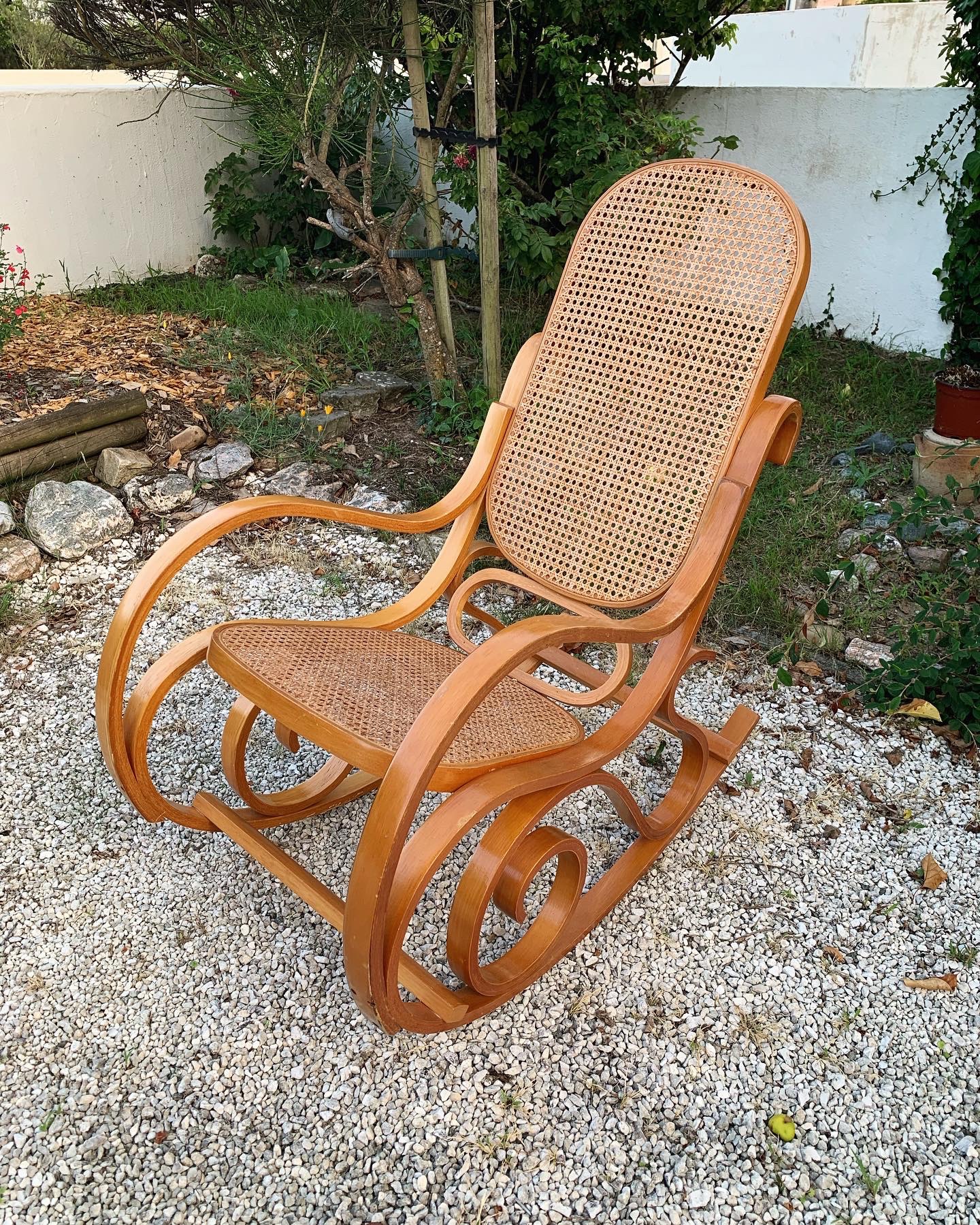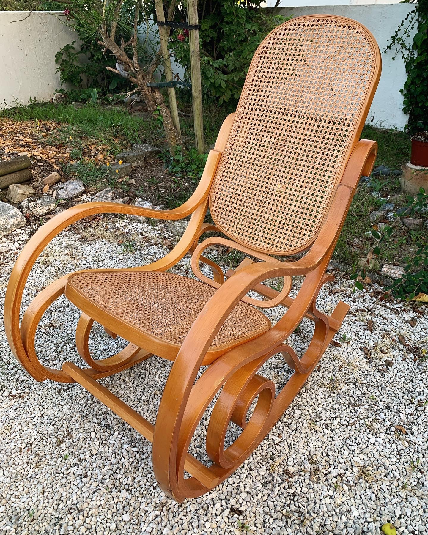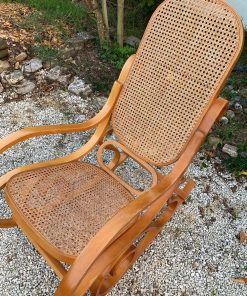 Rocking-chair en bois courbé couleur miel et cannage, dans le style Thonet.