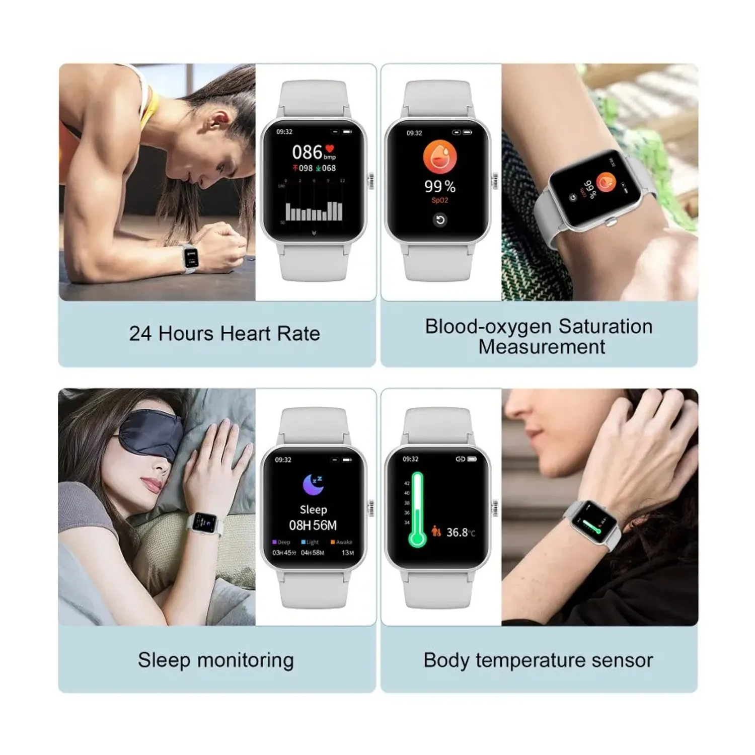 Avec notre montre connectée, vous bénéficiez d’un suivi de la santé 24h/24 et 7j/7. Grâce à son capteur de fréquence cardiaque avancé, elle surveille automatiquement votre fréquence cardiaque, la saturation en oxygène du sang et la température corporelle. Ces données sont accessibles directement sur la montre, vous permettant de rester informé de votre état de santé à tout moment.