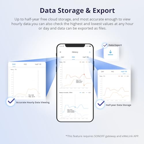 - Suivi et exportation des données : Stockez les données jusqu’à six mois dans le cloud et exportez-les facilement sous forme de fichiers CSV pour un suivi détaillé.