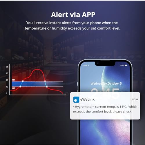 - Alertes instantanées : Recevez des notifications sur votre téléphone si les niveaux de température ou d’humidité dépassent les seuils que vous avez définis, vous permettant d’intervenir rapidement.