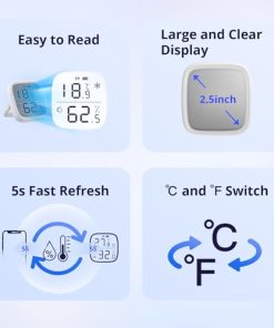 - Grand écran LCD : L’écran de 2,5 pouces affiche clairement les informations de température et d’humidité, avec des icônes intuitives pour indiquer les conditions ambiantes et l’état de la batterie.