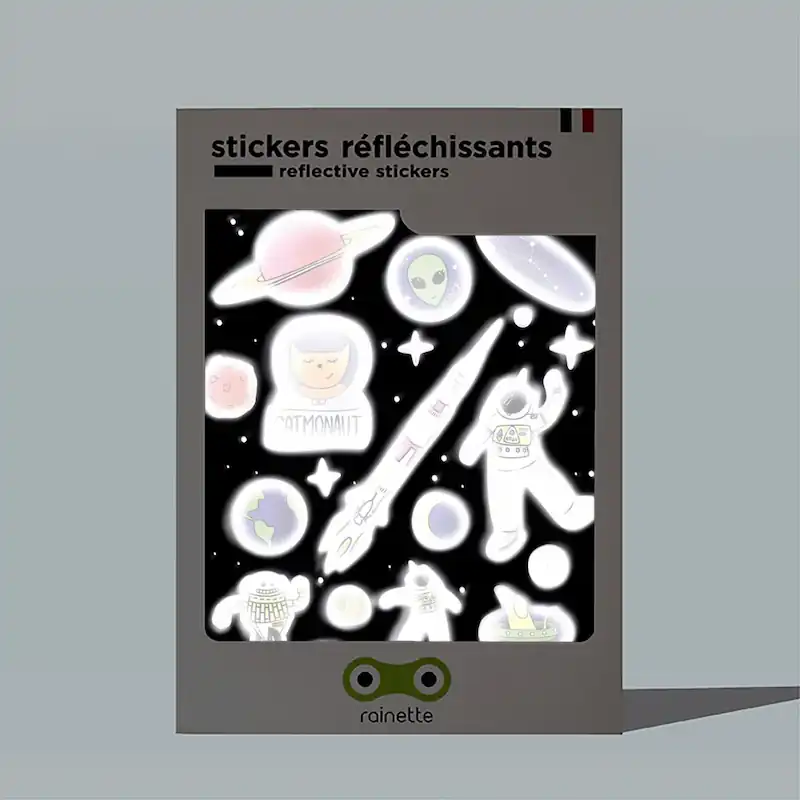 Les Stickers réfléchissants RAINETTE Espace vont révolutionner vos déplacements ! En effet, ces stickers sont parfaits pour renforcer votre visibilité et ajouter une touche personnelle à votre casque, vélo, cargo, trottinette et autres moyens de mobilité. Comment cela fonctionne ? Les microbilles de verre contenues dans le sticker réfléchissant, également appelées catadioptres, renvoient la lumière dans l’obscurité sous une source de lumière. Exactement comme des petits miroirs ! L’avantage des Stickers réfléchissants RAINETTE : ils sont solides et durables. En effet, ils ne nécessitent pas de source d’énergie pour fonctionner. Ainsi, ils ne produisent pas de pollution lumineuse inutile et sont donc moins perturbants pour la faune qu’une lumière allumée constamment. Enfin, les Stickers réfléchissants RAINETTE sont faciles à détruire en fin de vie et potentiellement recyclables et réutilisables.