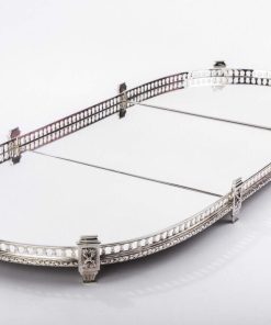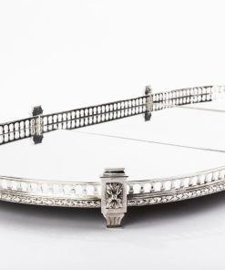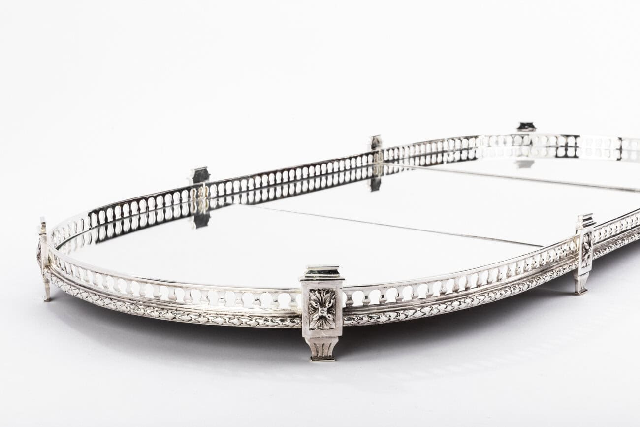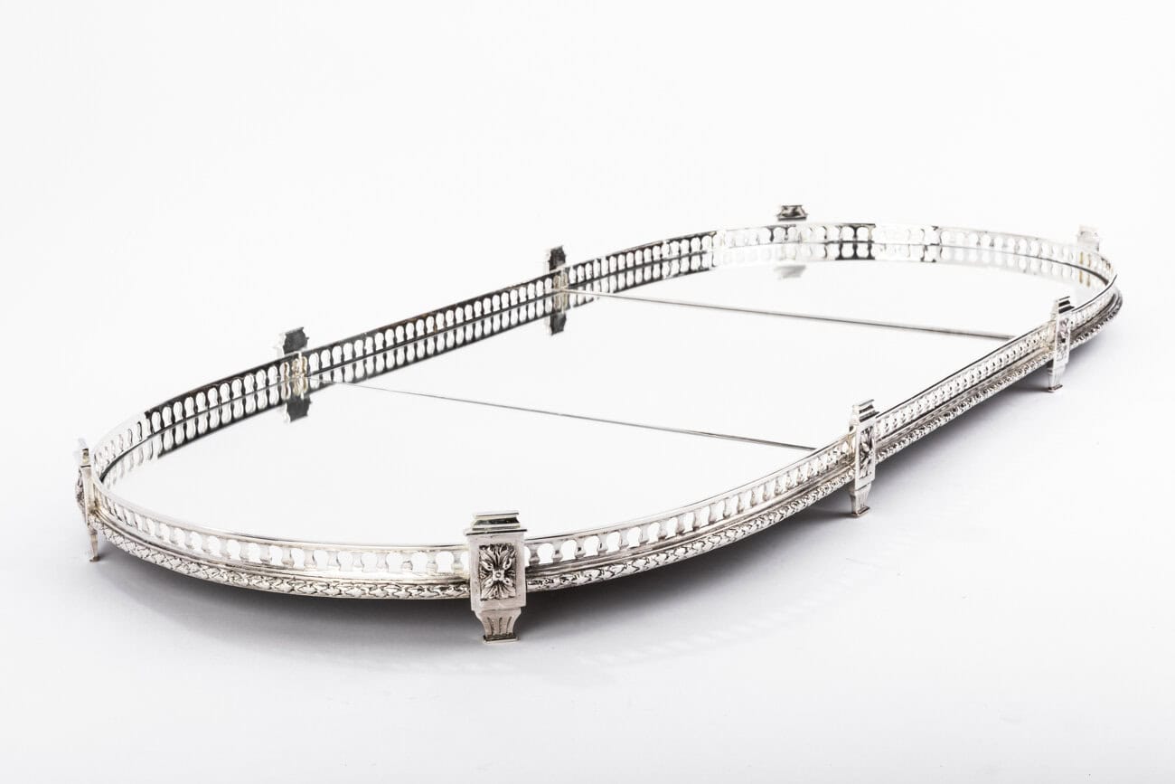 Surtout de table en bronze argenté ovale formé de trois parties attenantes, à fonds de miroirs sur parquet de bois, serti d’une galerie balustre en bronze argenté souligné d’une feuille de laurier et ponctuée de pilastres.