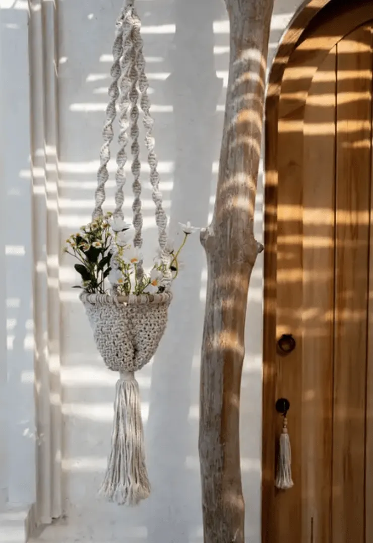 - Polyvalence : En plus d’accueillir des plantes, les suspensions en macramé peuvent servir à d’autres fins décoratives, telles que le rangement de petits objets, la création de luminaires originaux, ou simplement comme pièce maîtresse décorative.