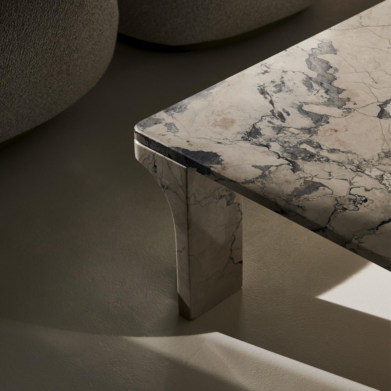 La table Doric est une conception de dualités, de contrastes et d’harmonies, synthétisant des caractéristiques opposées en une seule expression cohérente. La table est à la fois incurvée et géométrique, dure et douce, avec la forme rectangulaire du plateau contrebalancée par ses coins légèrement arrondis et les contours décoratifs des pieds sculptés.