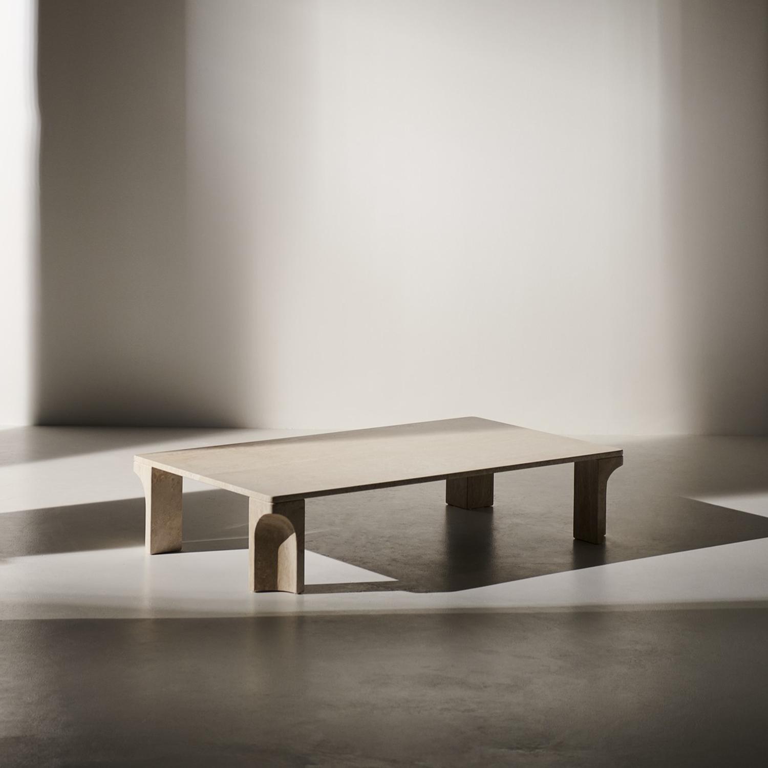 Les tables sont fabriquées en travertin ou en calcaire, des matériaux de construction utilisés depuis l’époque romaine. Bien que de couleur différente, les deux variétés de pierre naturelle ont une matérialité brute qui ajoute une texture et une profondeur riches à la table, et un veinage naturel qui apporte un intérêt visuel inhérent à l’expression de chaque table.