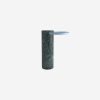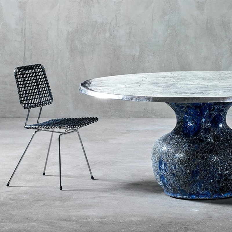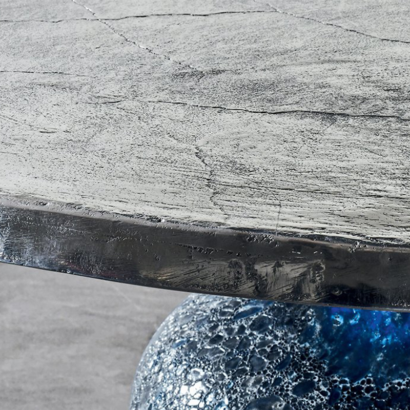 Table, dessus en fonte d’aluminium, en marbre ou en bois. Finitions bois: noyer américain / chêne verni naturel; chêne blanchi, chêne laqué blanc, gris, bleu ardoise, noir. Pied central en céramique bleu. Disponible en deux diamètres