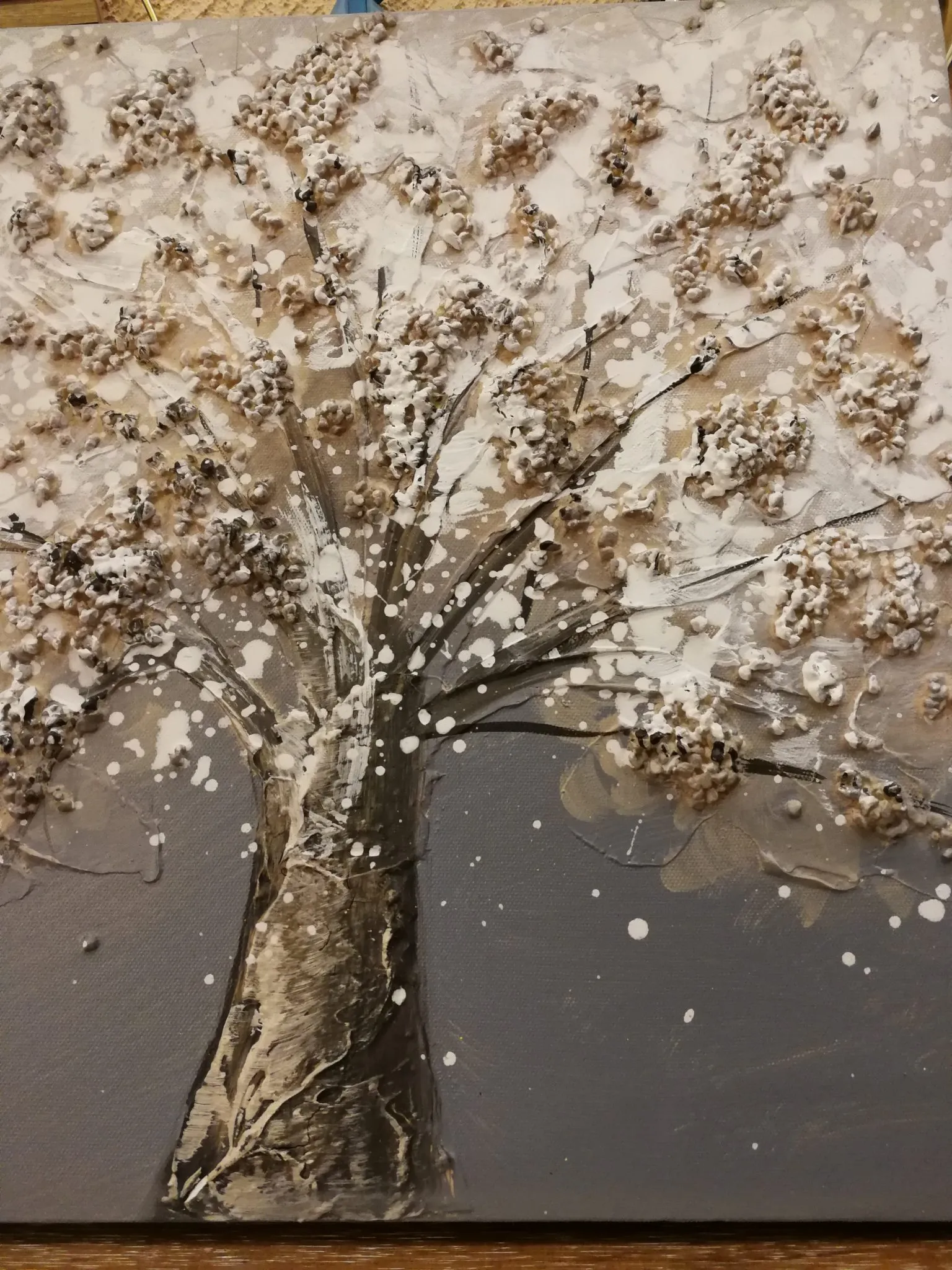 Magnifique tableau d’un arbre aux nuances de gris, blanc et argenté et avec des reliefs.