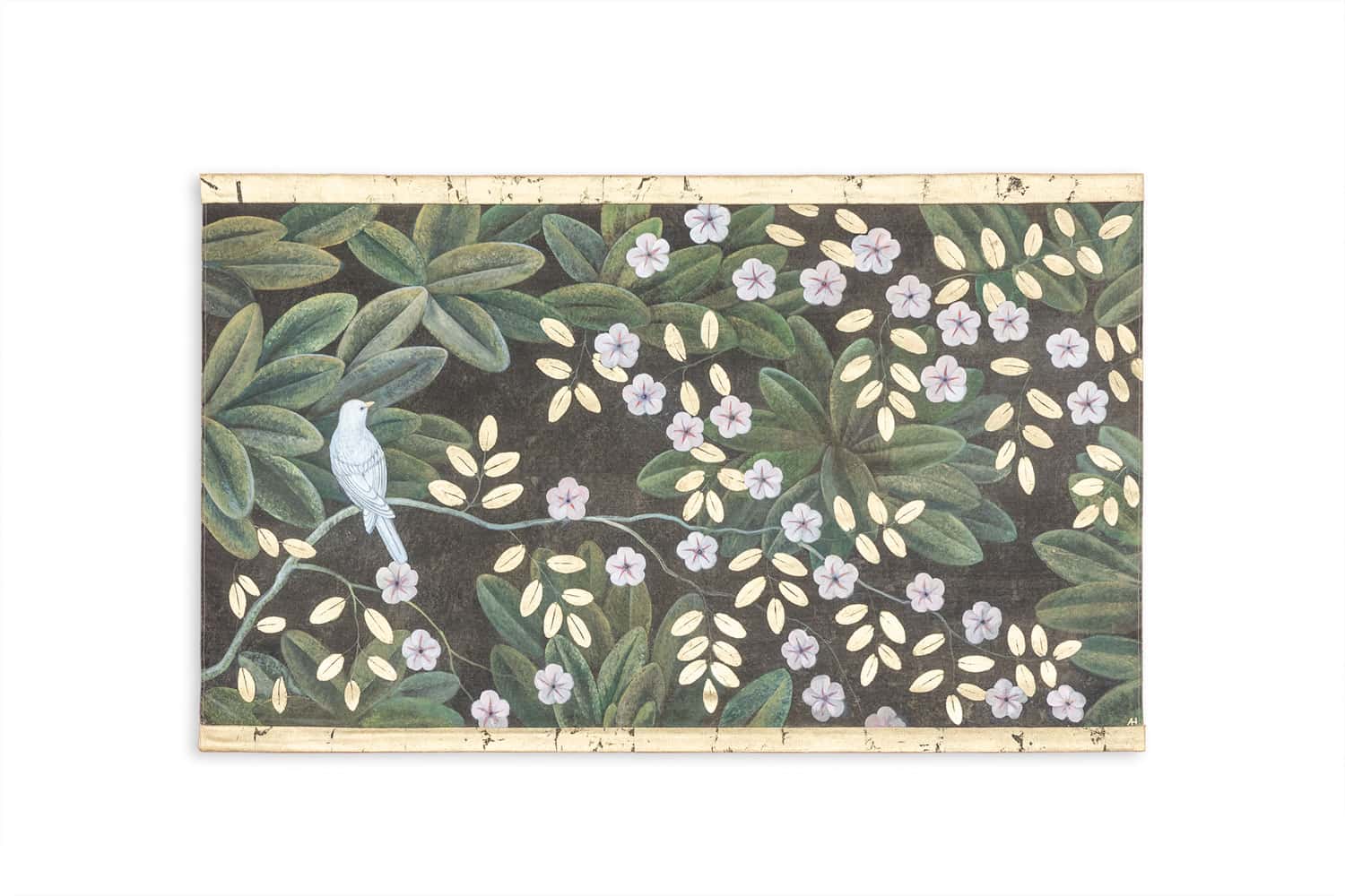 Toile brute en lin peinte à la main avec des pigments naturels et motifs dorés réalisés à la feuille de cuivre. Toile tendue à l’aide de deux baguettes en bois dont celle du bas est amovible, permettant de la rouler pour le transport.