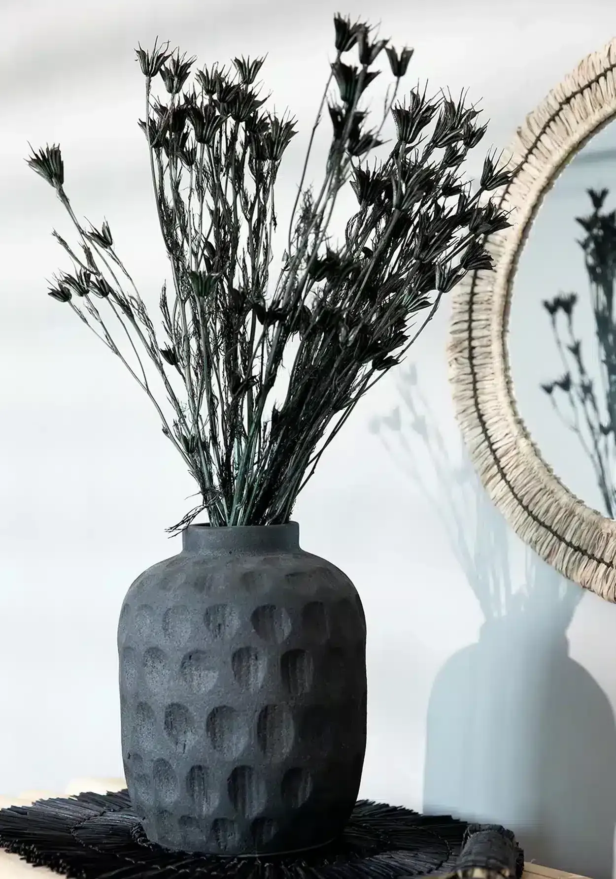Notre vase en terre cuite noir de taille L est bien plus qu’un simple récipient pour vos fleurs séchées. Il est conçu avec un motif contemporain qui apportera une touche de modernité à n’importe quel espace. Le noir profond de ce vase crée un contraste saisissant avec les couleurs des fleurs séchées, mettant en valeur leur beauté naturelle.
