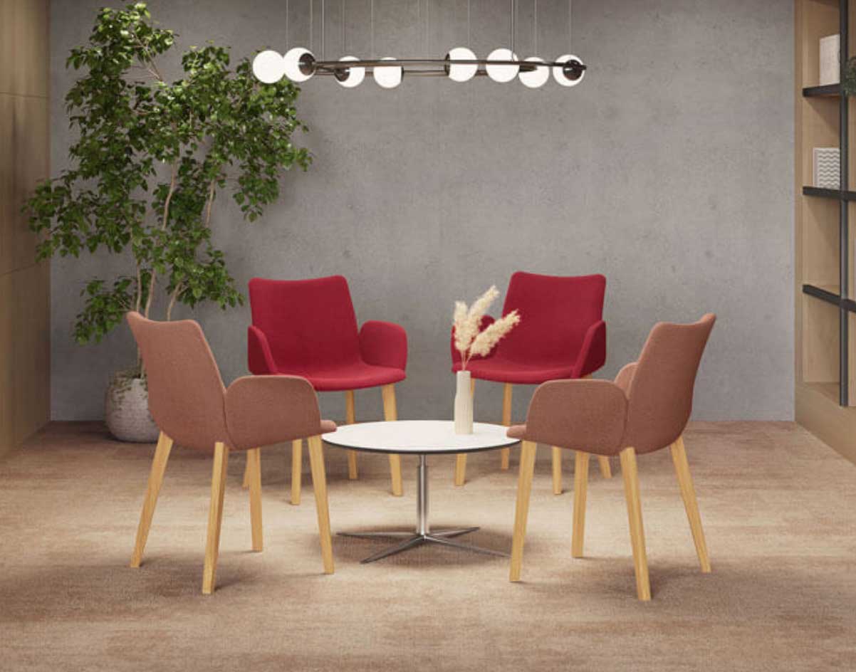 Le fauteuil de réunion tapissé Vita se distingue par son design contemporain et convivial. Parfaitement adapté pour des réunions confortables et productives, ce siège de réunion est constitué d’une assise tapissée disponible dans de nombreux coloris de tissu et d’un piètement 4 pieds en bois très esthétique.