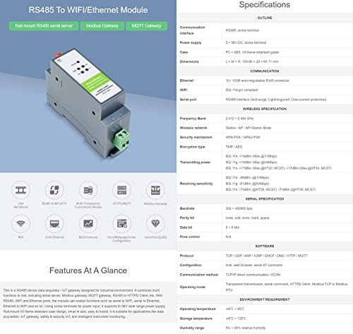 Pour ce qui est de la communication, le module est équipé d’un connecteur RJ45 auto-négociation 10/100M, d’une interface RS485 avec protection contre les surtensions, la foudre et les surintensités. La partie sans fil est conforme à la norme 802.11b/g/n avec une bande de fréquence allant de 2.412 à 2.484 GHz.